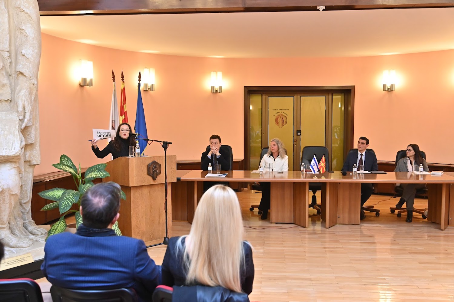 На Комеморативниот настан се обратија амбасадорката на Израел, Вивиен Ајсен, пратеничката Рашела Мизрахи, директорот на Фондот на холокаустот на Евреите од Македонија, Горан Садикаријо и раководителот на Универзитетската програма за изучување на холокаустот, проф. д-р Мишо Докмановиќ. На настанот и зборуваше и Ефрат Барух Алтарац, снаа на последната преживеана Еврејка од Штип.