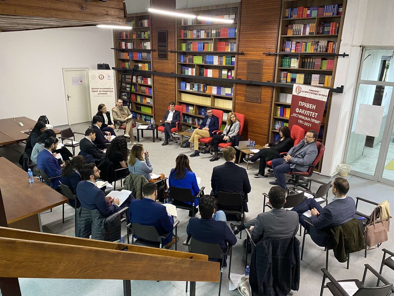 На 22.3.2024 г., Правниот факултет „Јустинијан Први“ беше домаќин на делегација од професори и студенти на FLETCHER, Graduate School of global affairs at Tufts University предводена од Арик Бураковски помошник директор на програмата за Русија и Евроазија при Флечер школата. Одржаа средба со Деканот на Факултетот проф. д-р Сашо Георгиевски и панел дискусија со професорите Ненад Марковиќ, Ирена Рајчиновска Пандева од Правниот факултет, Албулена Халили од Универзитетот Југоисточна Европа, Билјана Бејкова од ИнфоЦентар, Филип Стојановски од Метаморфозис и Сефер Селими од Democracy Lab.
