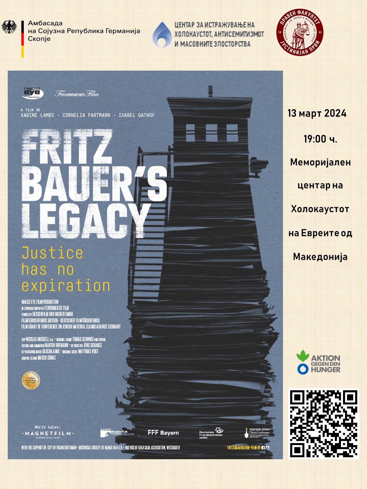 На 13 март 2024 година во Меморијалниот центар на холокаустот на Евреите од Македонија се одржа проекција и дискусија за документарниот филм „Наследството на Фриц Бауер“. На проекцијата присуствуваа и студентите кои ги посетуваат курсевите за изучување на холокаустот кои Правниот факултет „Јустинијан Први“ ги реализира со поддршка на Claims conference New York (Конференција за еврејските материјални побарувања од Германија) во учебната 2023/24 година. Присутните ги поздравија директорот на Фондот на холокаустот, Горан Садикаријо, заменик амбасадор на Германија во Скопје, Ото Граф и нашата проф. д-р Александра Груевска Дракулевски кои и дискутираа за филмот. Проекцијата на филмот беше во организација на Центарот за истражување на холокаустот, антисемитизмот и масовните злосторства на нашиот Факултет, Фондот на холокаустот на Евреите од Македонија и германската амбасада во Скопје.