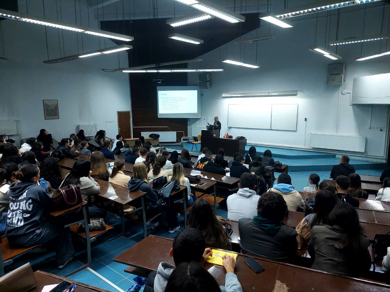 Предавањето на професорот Цукимура беше фокусирано на уставите на современа Јапонија, а студентите имаа можност да се запознаат со главните специфики на двата јапонски устави донесени во последните 140 години, но и на влијанието на Втората светска војна на државното уредување на оваа држава. Предавањето се реализира на покана на професорот по историја на правото, д-р Мишо Докмановиќ, а како дел од активностите за унапредување на меѓународната соработка и видливост на Правниот факултет.