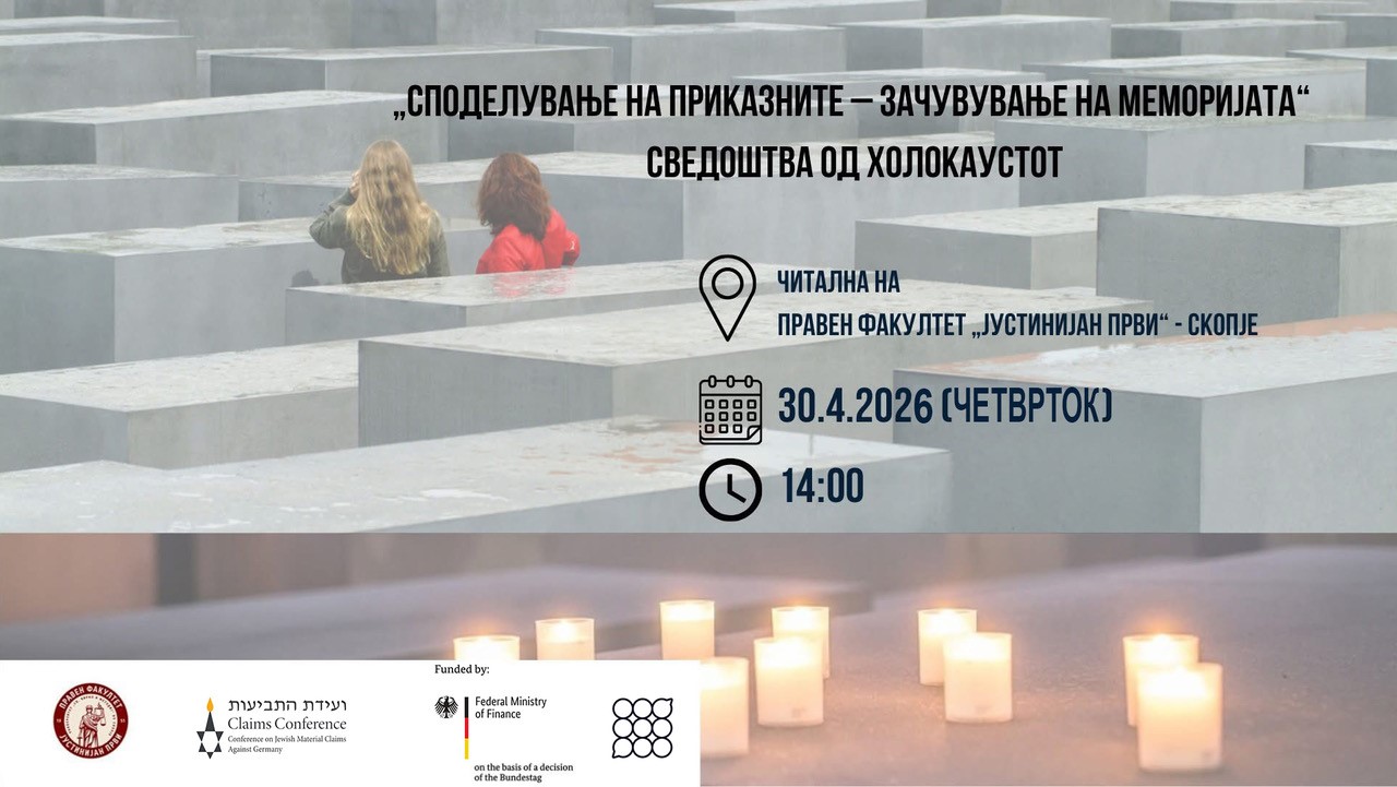„Споделување на приказните – Зачувување на меморијата“ (сведоштва од Холокаустот) е јавен настан кој ќе го водат студентите од Правниот факултет „Јустинијан Први“- Скопје кои го следат курсот по Антисемитизам, Холокауст и човекови права. Настанот е фокусиран на 5 клучни теми: Животот во гетата, Духовниот отпор во гетата (архивата на Ојнег Шабес), Востанието во Варшавското гето, Идентитетски карти и, искуствата на Холокаустот низ призма на меѓународните судски процеси.